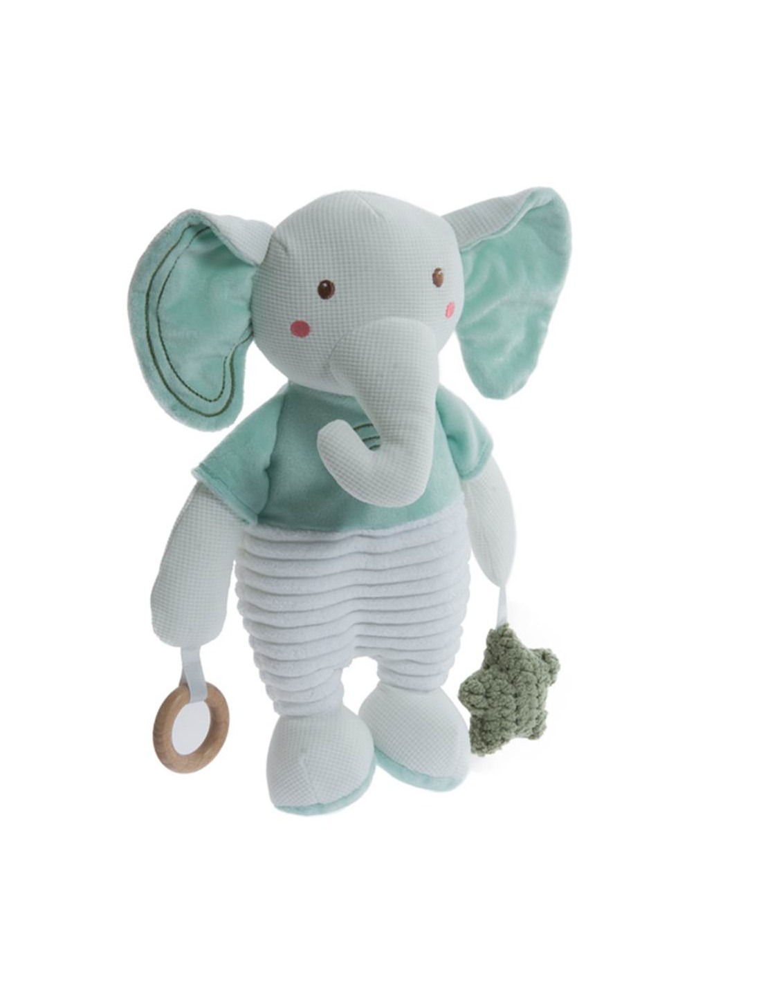 -Peluche Didáctico Elefante de la marca Gamberritos. Peluche didáctico de 36 cm para bebé con forma de elefante, confeccionado en tejido aterciopelado y crochet, con un diseño que combina el color verde y el blanco. Incluye un sonajero y un mordedor en las manos.